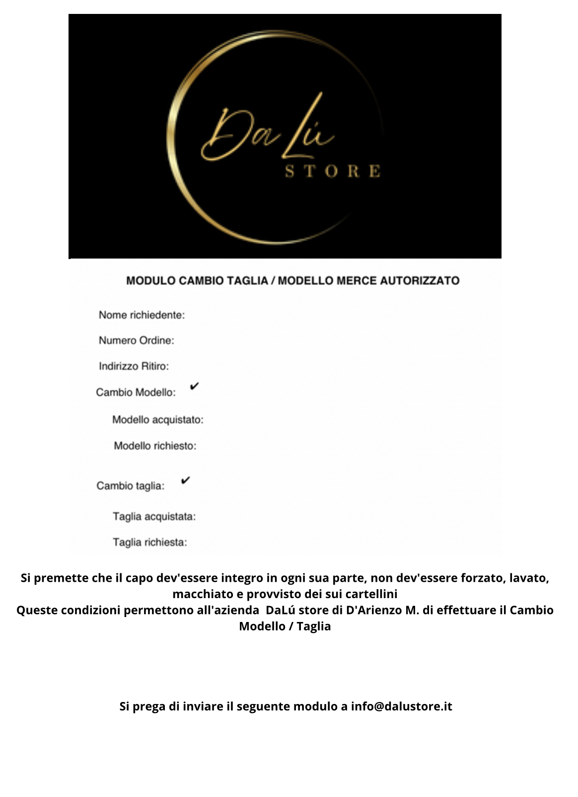 È possibile effettuare il cambio solo per una diversa misura o un diverso colore dello stesso articolo, qualora disponibile, oppure cambio modello se autorizzato dall’azienda. Il Cliente dovrà inviare via mail ad info@dalustore.it il modulo cambio taglia (CLICCA QUI) entro 3 giorni dalla data di ricevimento dei Prodotti. Il Servizio Clienti di Dalú provvederà, una volta ricevuta la comunicazione, ad aprire una pratica per il cambio della merce e a comunicare al Cliente le istruzioni sulla modalità di restituzione dei Prodotti.