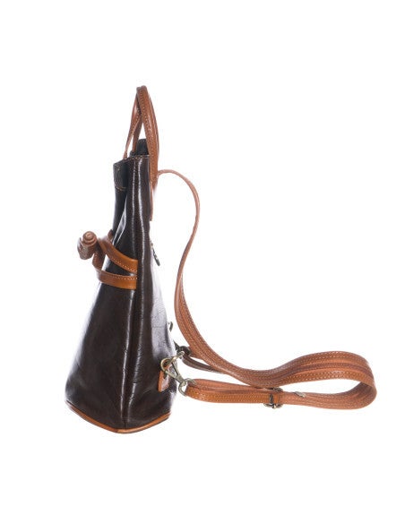 Il modello Gaetana è un marsupio da donna dalla forma arrotondata, caratterizzata da bretelle con chiusura a zip per poterlo indossare sia come zainetto che come tracolla e da una chiusura con gancio in cuoio.